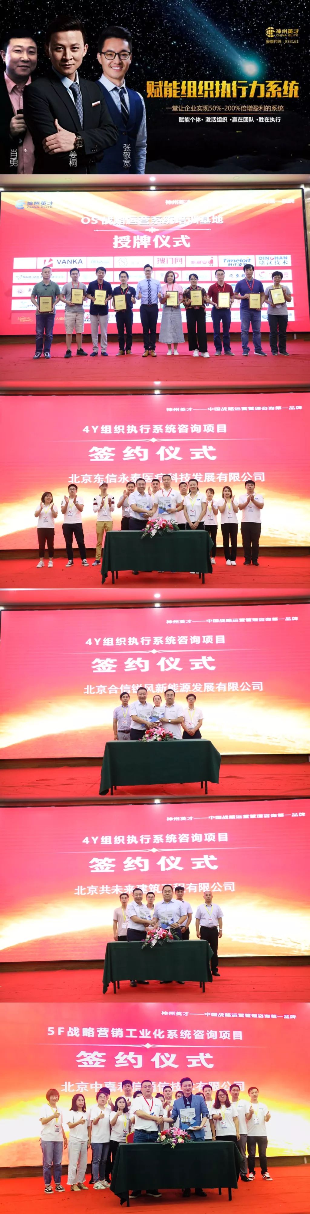 課程的最后,為投資團(tuán)隊(duì)持續(xù)成長,實(shí)現(xiàn)企業(yè)至上而下形成共識,瑰夏傳奇貿(mào)易、思騰合力科技、博睿創(chuàng)維體育、卓越元征廣告、興業(yè)工程造價、圓方環(huán)保設(shè)備、中瑞國興科技、恩澤康泰生物、聯(lián)創(chuàng)聚興科技加入神州英才OS系統(tǒng)培訓(xùn)基地,為員工成長投資。東信永泰醫(yī)療、合信銳風(fēng)新能源、共未來建筑工程與神州英才簽約達(dá)成4Y組織運(yùn)營管控項(xiàng)目咨詢合作;中嘉和信通信技術(shù)與神州英才簽約達(dá)成營銷工業(yè)化項(xiàng)目咨詢合作。攜手英才,為企業(yè)發(fā)展保駕護(hù)航。